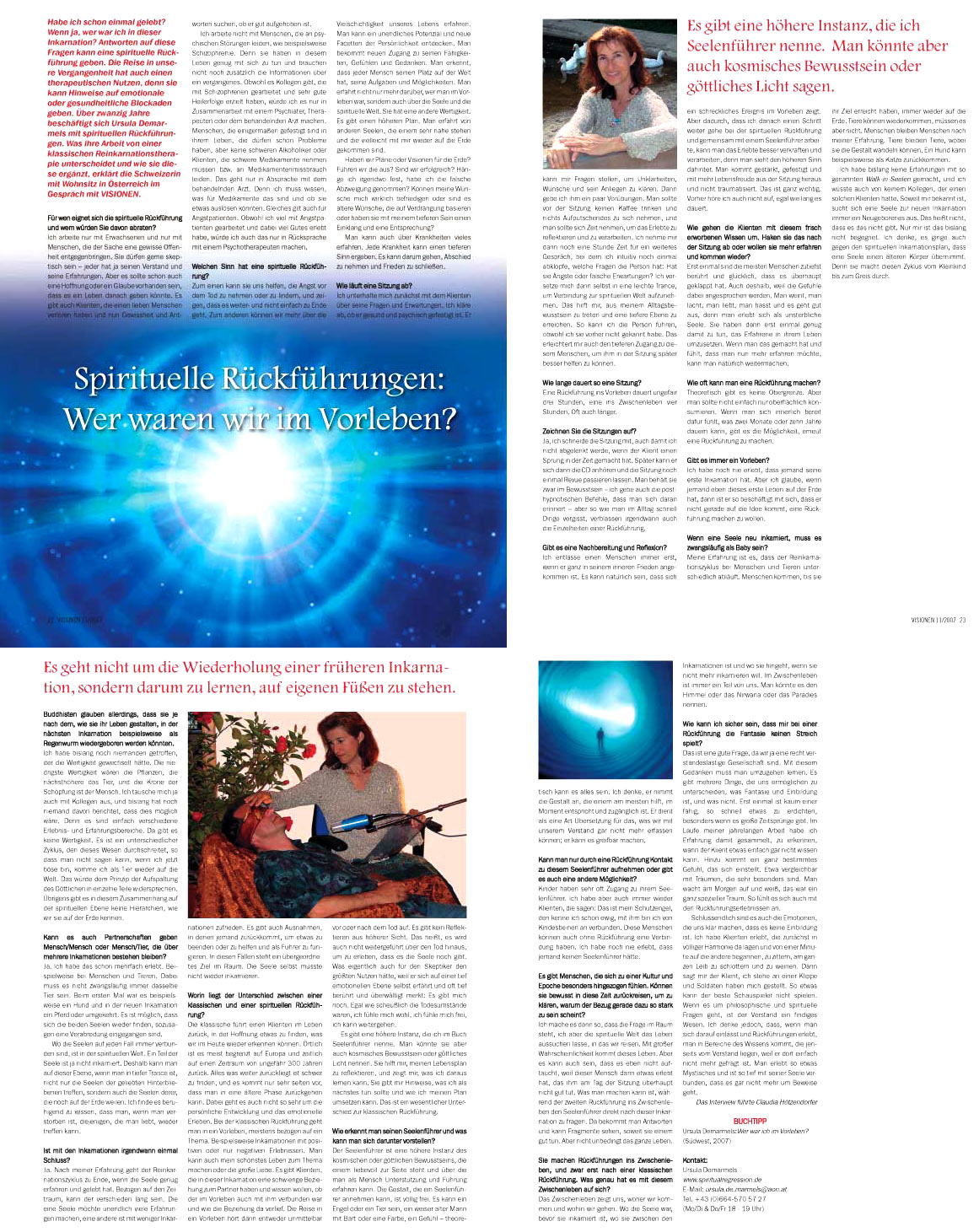Wer waren wir im Vorleben? Claudia HÖTZENDORFER im Magazin für ein ganzheitliches Leben VISIONEN. Interview mit Ursula Demarmels über ihre Arbeit und ihr Buch "Wer war ich im Vorleben" (Visionen 11: 22-25, 2007; jpg, 461 kB)